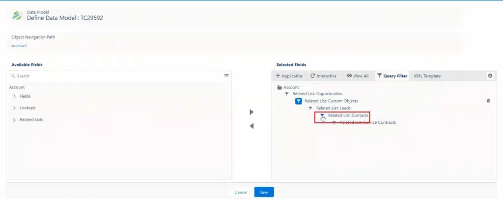 You can add to the Data Model filters based on Related Lists included in the Data Model. The records imported from Salesforce, are filtered when generating output, according to the query criteria you define.