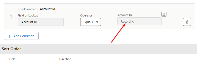 - Set a condition where the Field or Lookup is an Id path of the form main object(e.g., Account Id) and Operator is Equals.